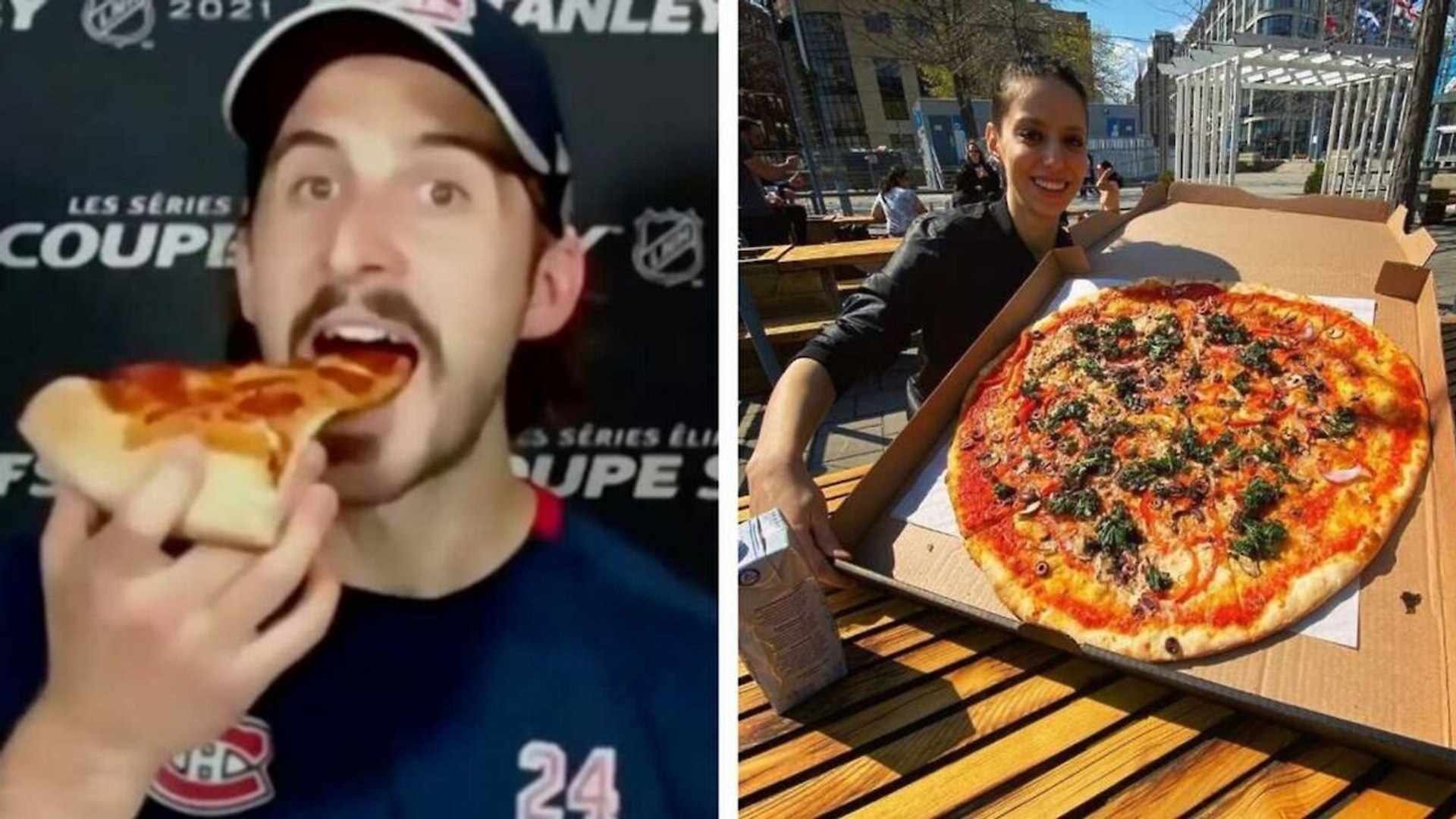 May 31 at 7:45 pm · ah le goût exquis de la victoire! Merci paul bon appétit philippe. It's not the first time. Il arrive pour une deuxième fois avec une pointe de pizza après une victoire des canadiens de montréal. Phillip danault delivers pizza to cole caufield before press conference stanley sweeney.