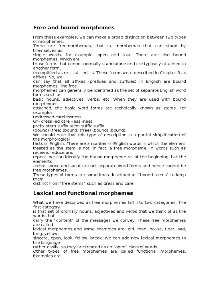 Closed class items are often called 'functional' items because they typically have a grammatical function such as showing agreement, or marking or changing the category of other items to which they attach. Bound morphemes, we looked at the two main categories of morphemes, free and bound morphemes. Other terms for the contrast lexical vs. This paper critically examines a variety of arguments that have been put forward as evidence for ug, focussing on the three most powerful ones: In our last post on free vs.